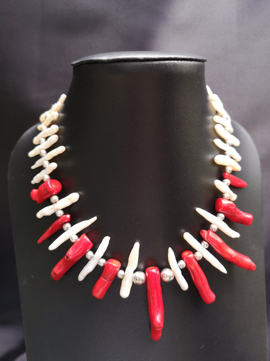 Coral rojo, perlas de plata .925 y perlas de rio - Collar